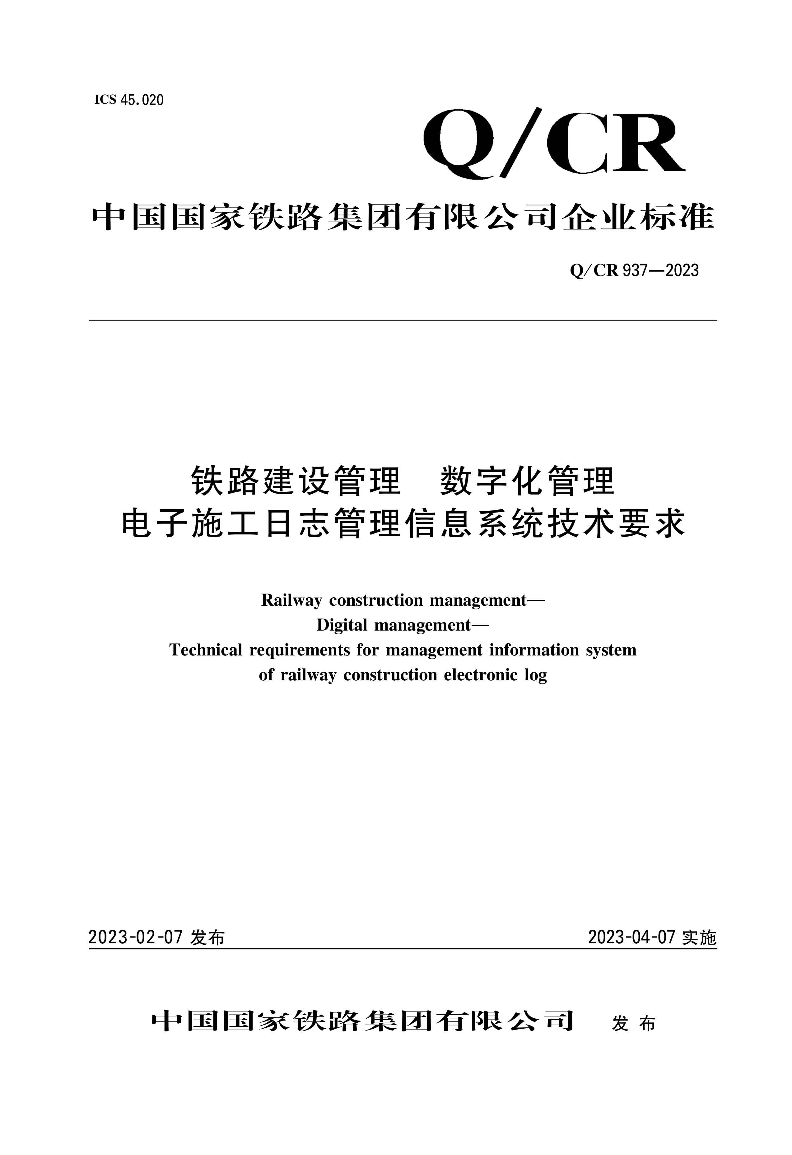 书名:铁路建设管理 数字化管理 电子施工日志管理信息系统技术要求 Q/CR 937—2023(内部用书)