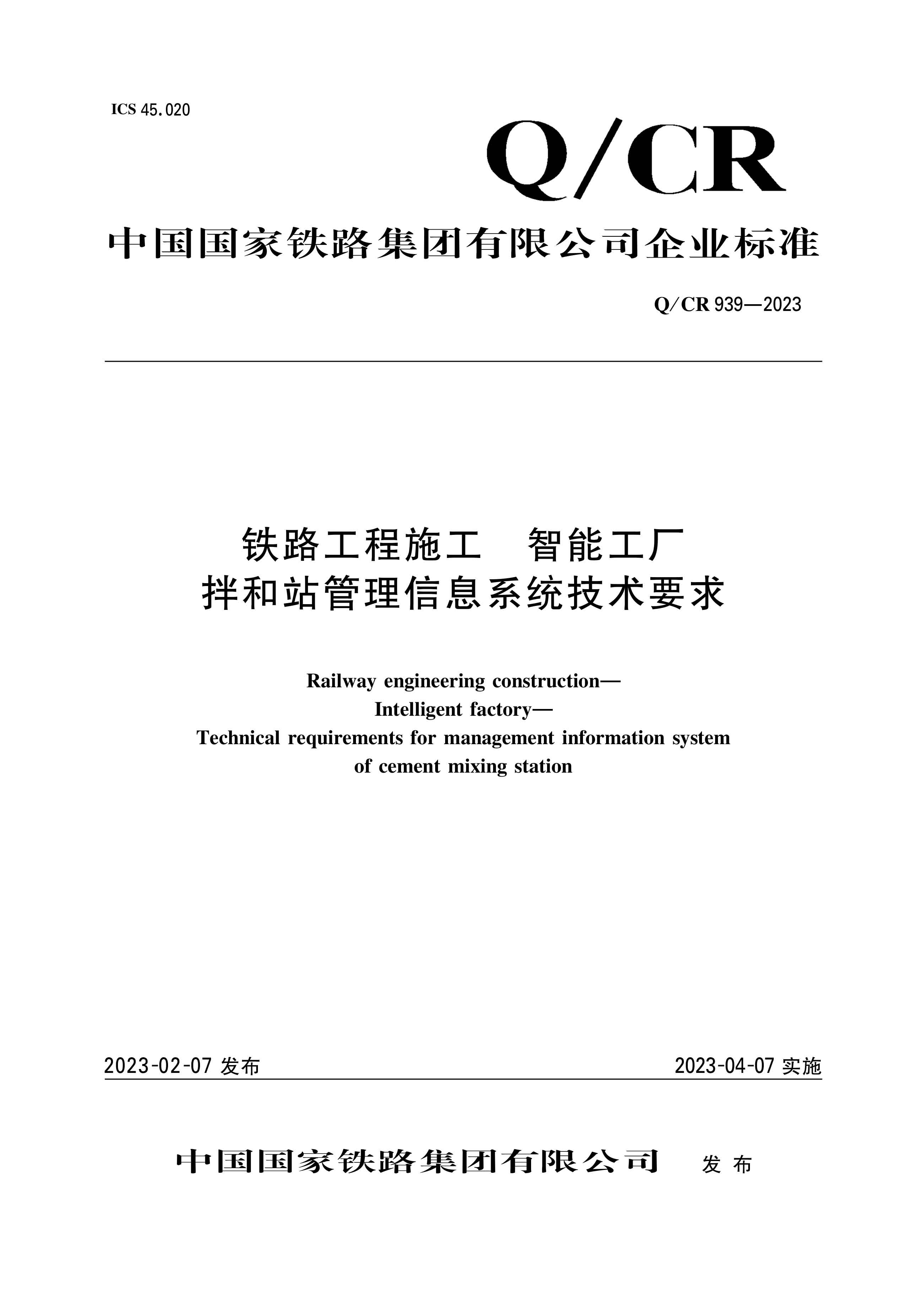 书名:铁路工程施工 智能工厂 拌和站管理信息系统技术要求 Q/CR 939—2023(内部用书)