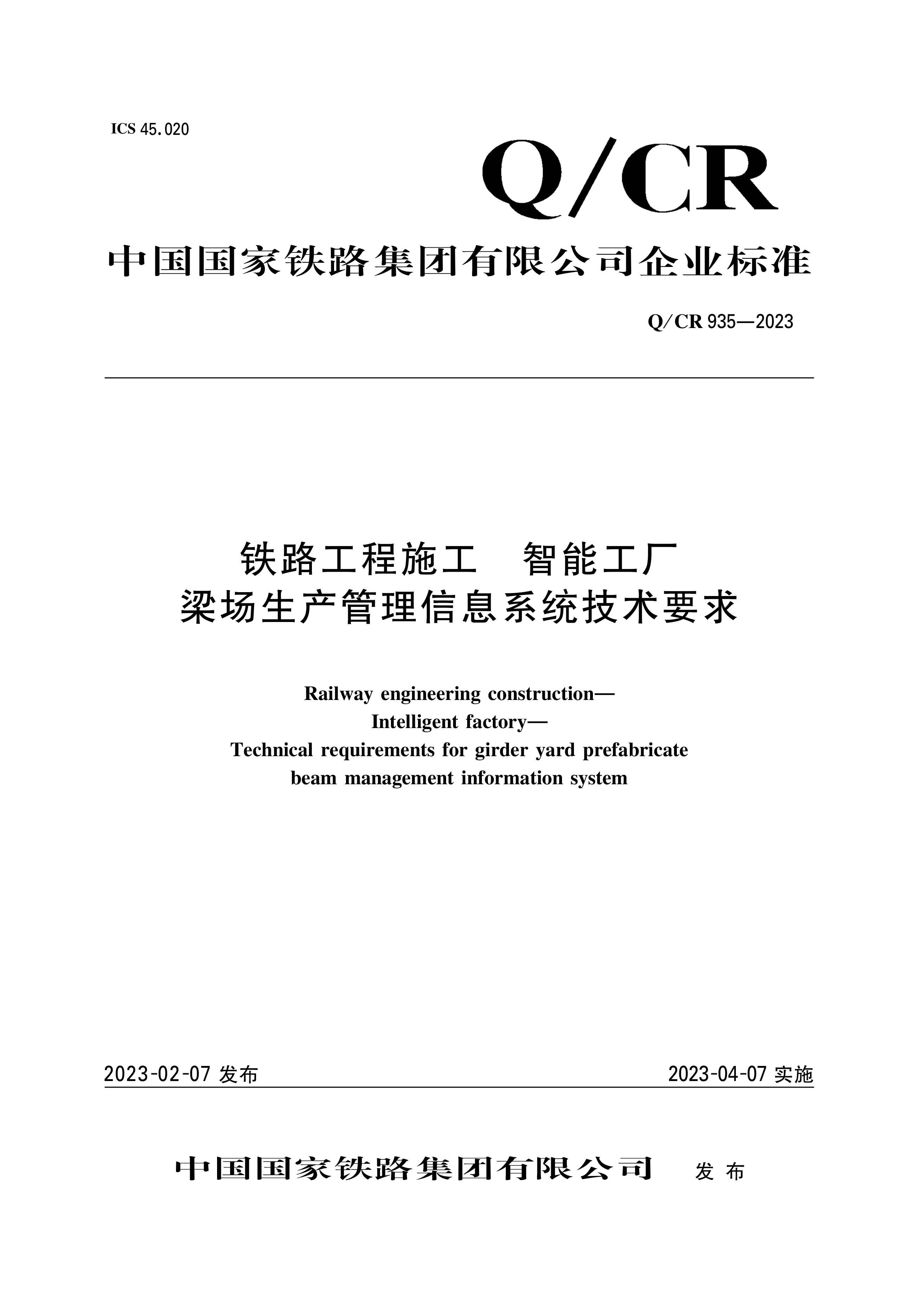 书名:铁路工程施工 智能工厂 梁场生产管理信息系统技术要求 Q/CR 935—2023(内部用书)