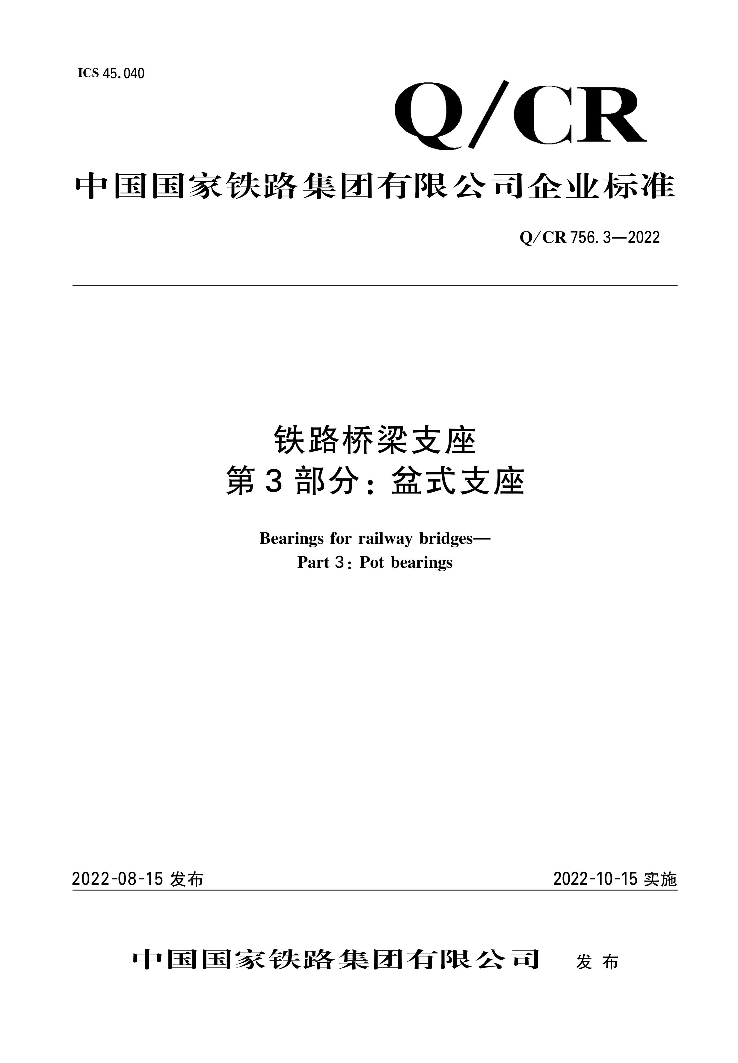 书名:铁路桥梁支座 第3部分:盆式支座 Q/CR 756.3—2022 (内部用书)