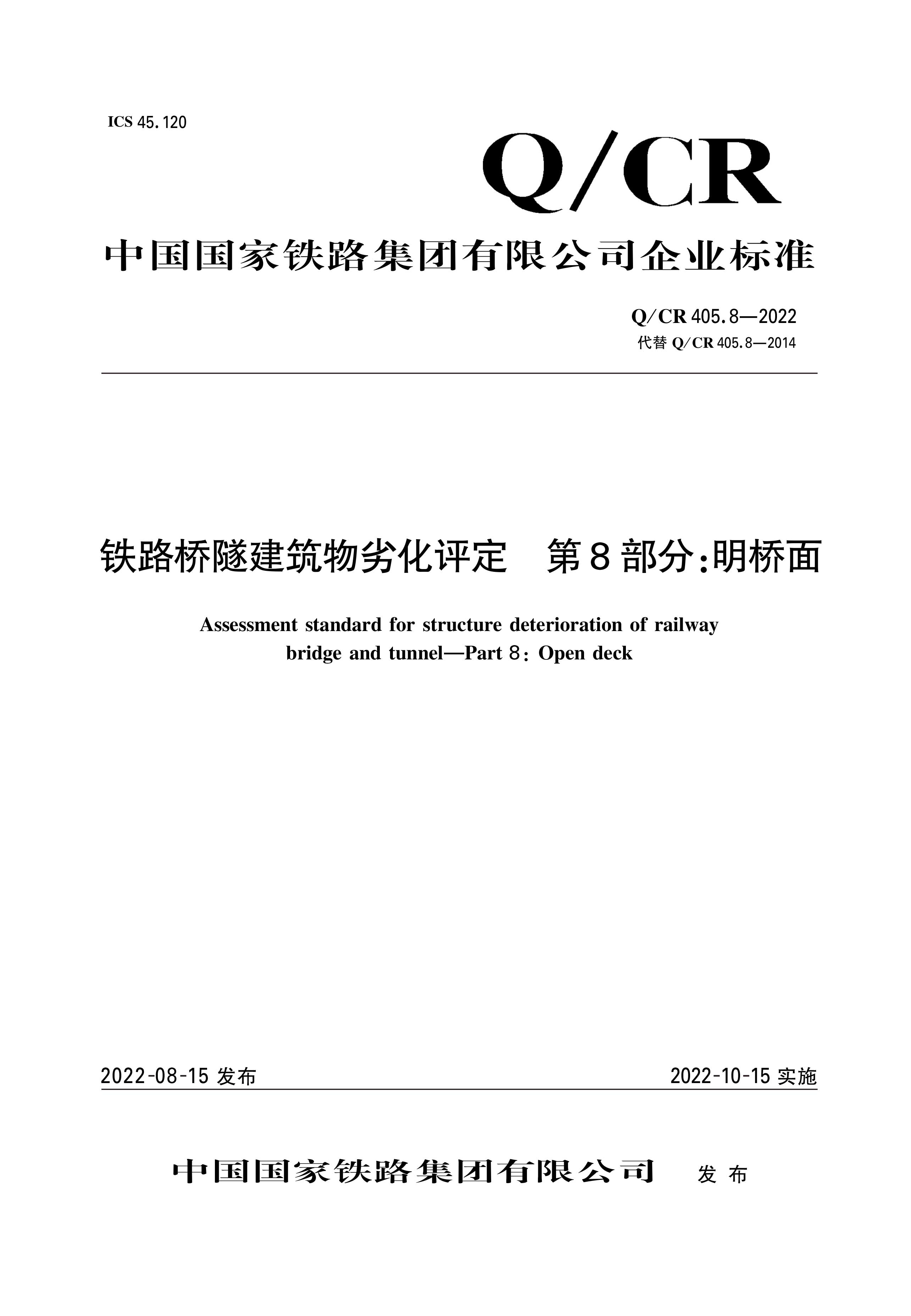 书名:铁路桥隧建筑物劣化评定 第8部分:明桥面 Q/CR 405.8—2022 (内部用书)