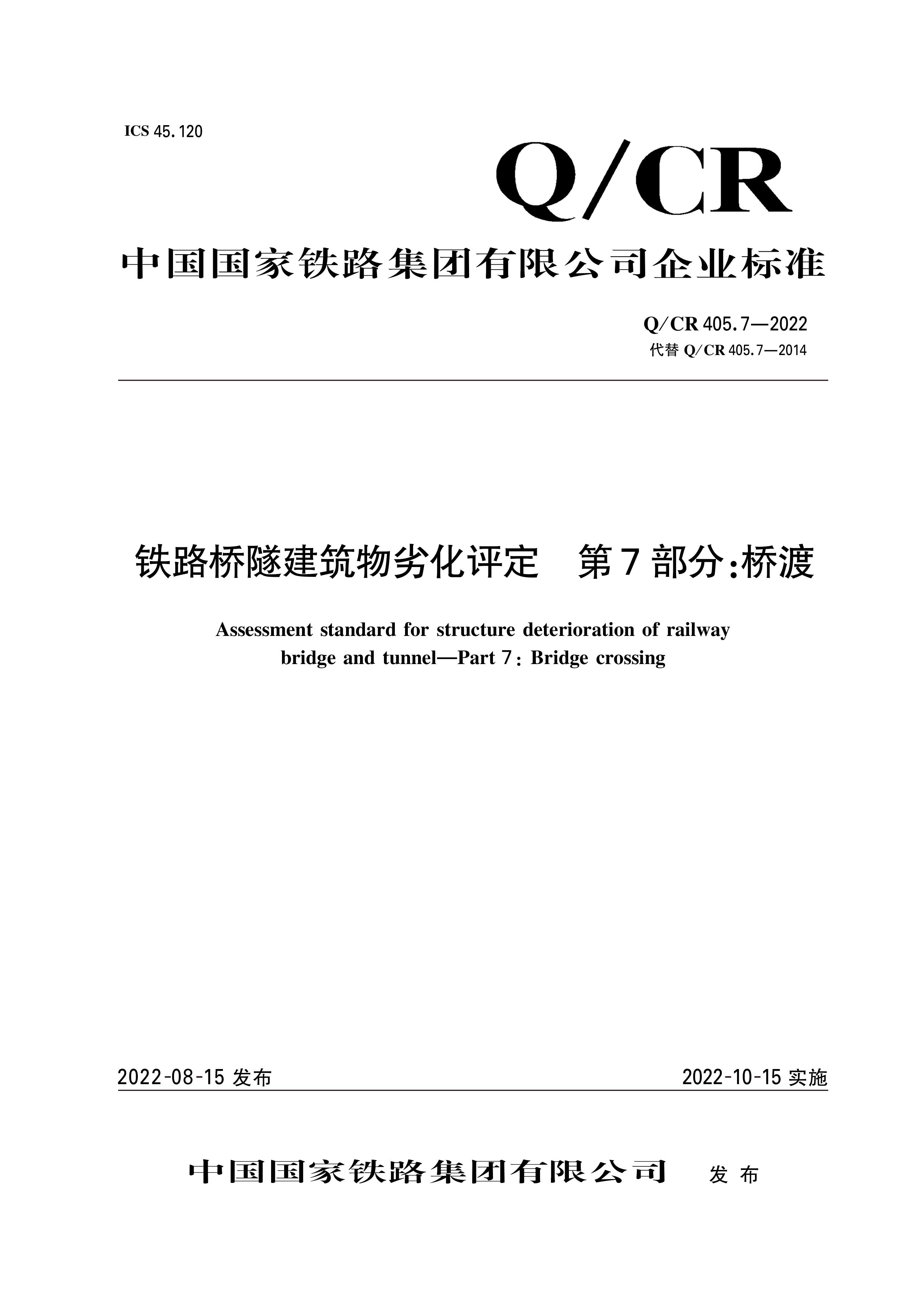 书名:铁路桥隧建筑物劣化评定 第7部分:桥渡 Q/CR 405.7—2022 (内部用书)