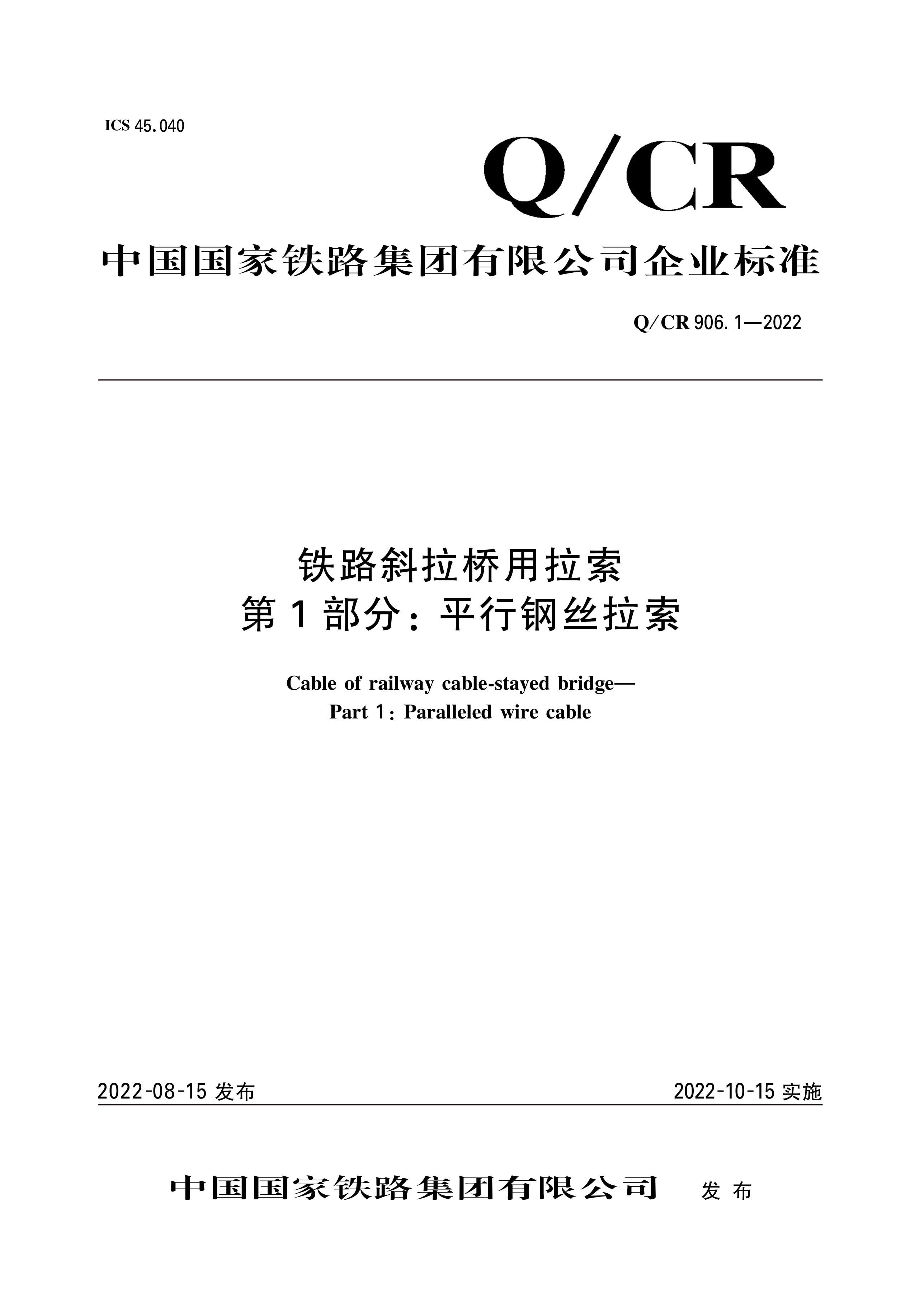 书名:铁路斜拉桥用拉索 第1部分:平行钢丝拉索 Q/CR 906.1—2022 (内部用书)