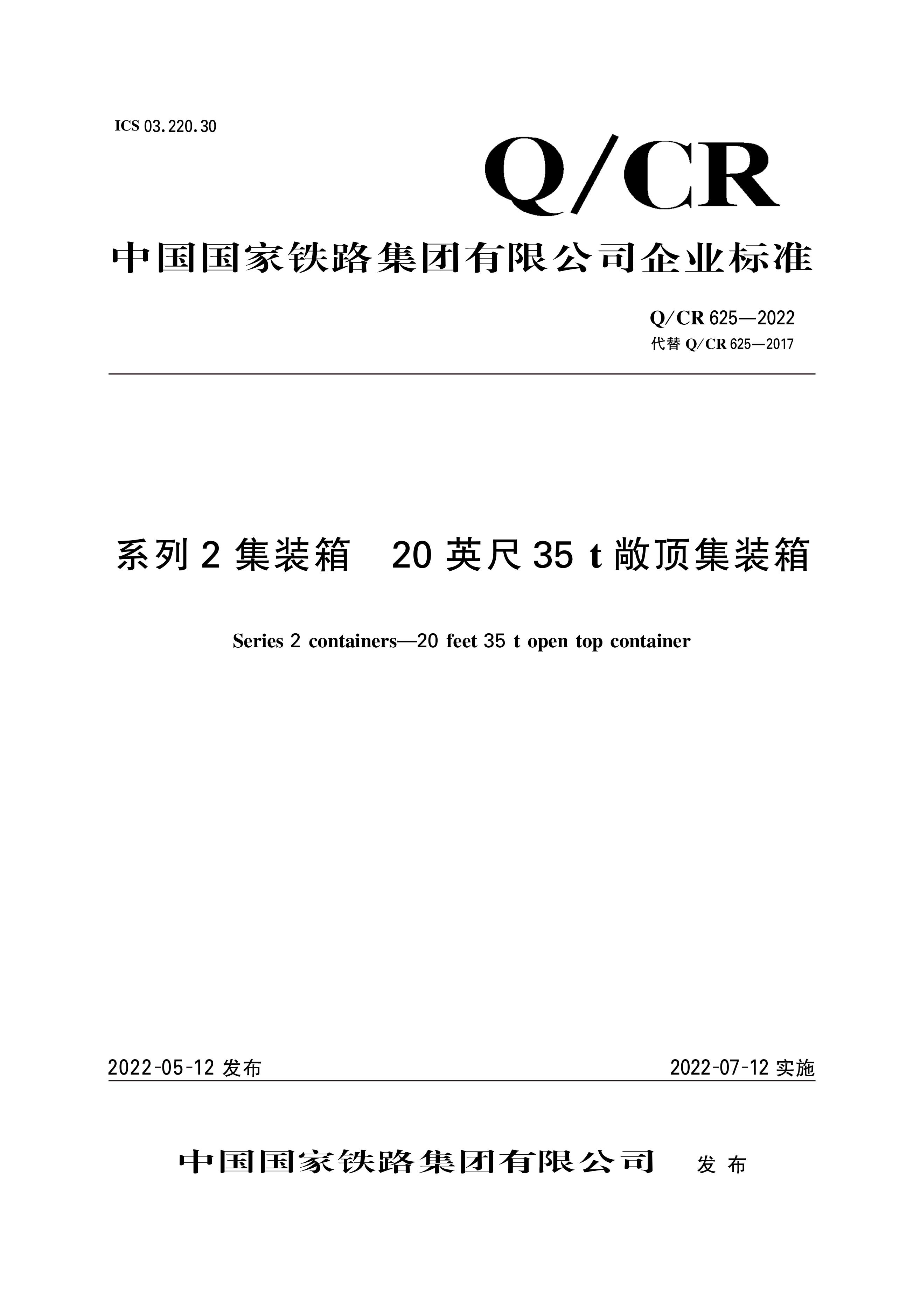 书名:系列2集装箱 20英尺35t敞顶集装箱(Q/CR 625—2022)