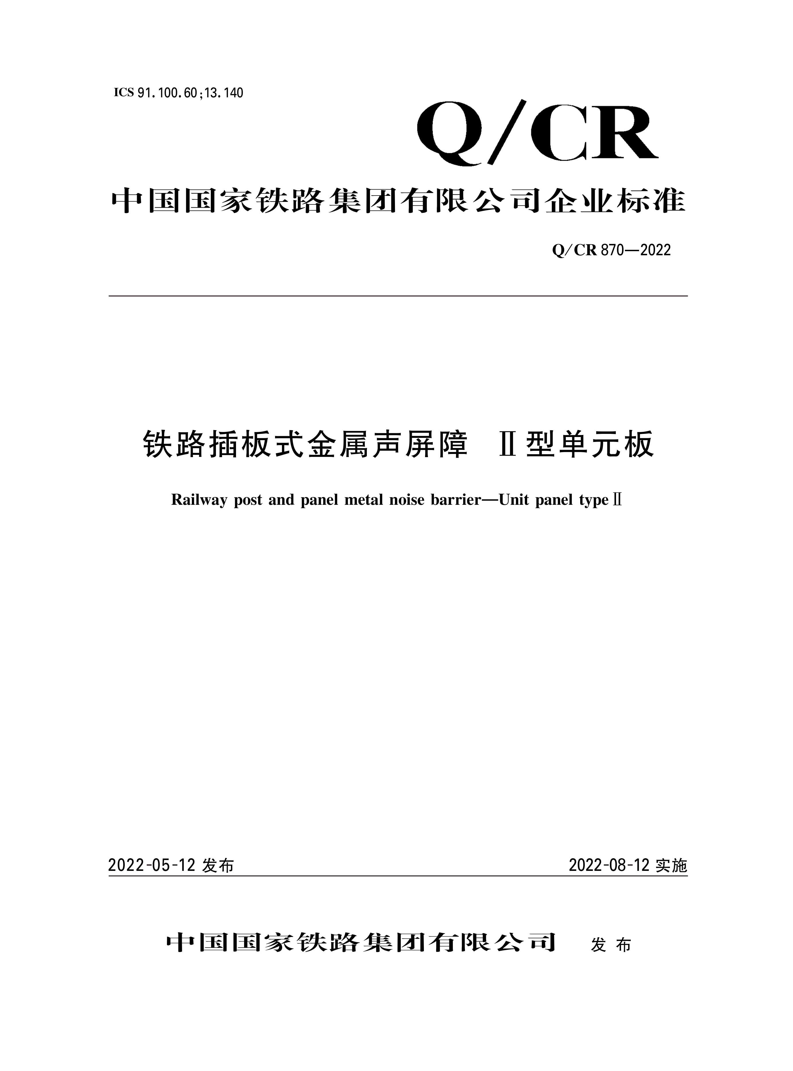 书名:铁路插板式金属声屏障 II型单元板Q/CR 870—2022(内部用书)