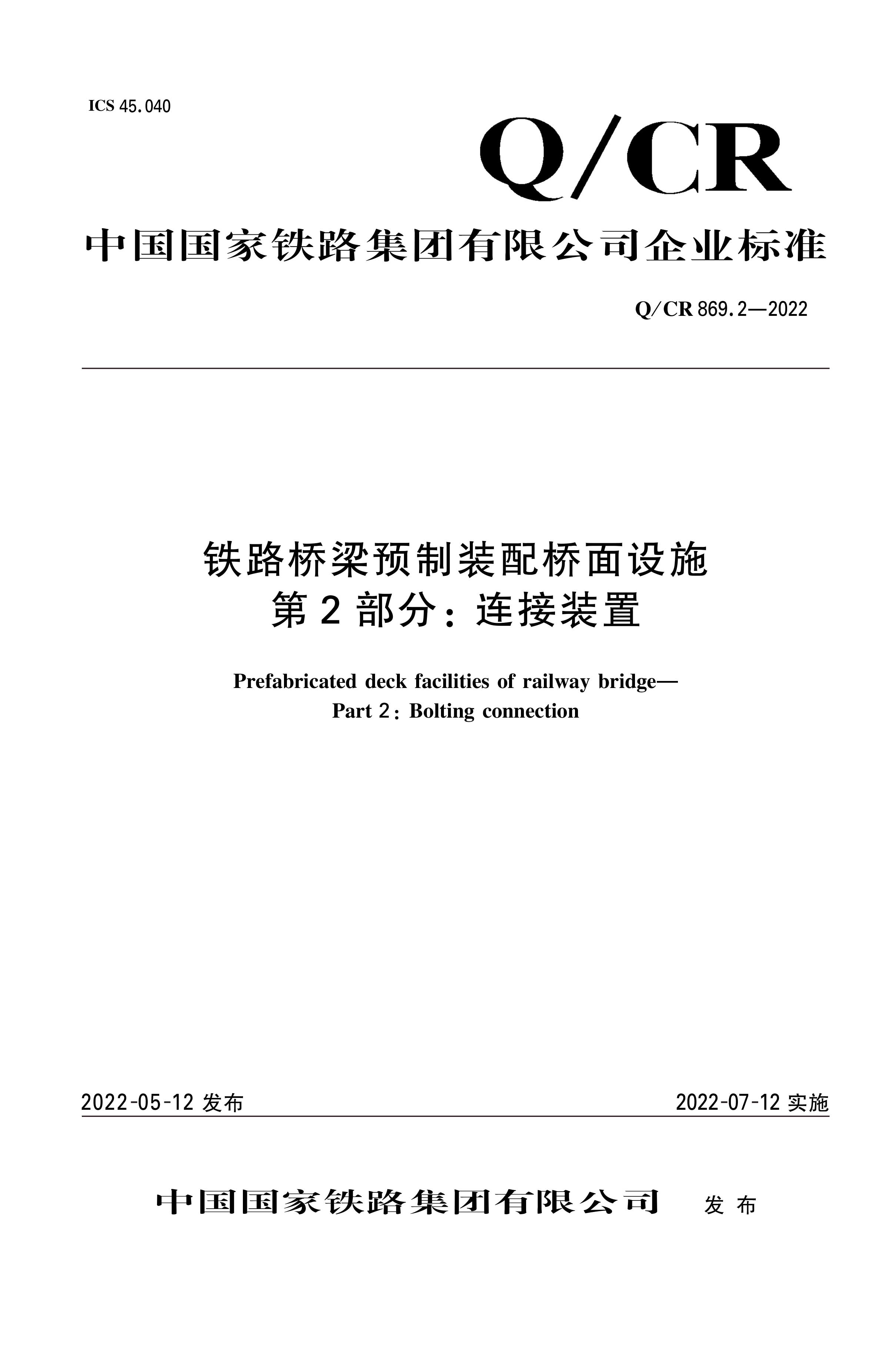 书名:铁路桥梁预制装配桥面设施 第2部分:连接装置Q/CR 869.2—2022(内部用书)