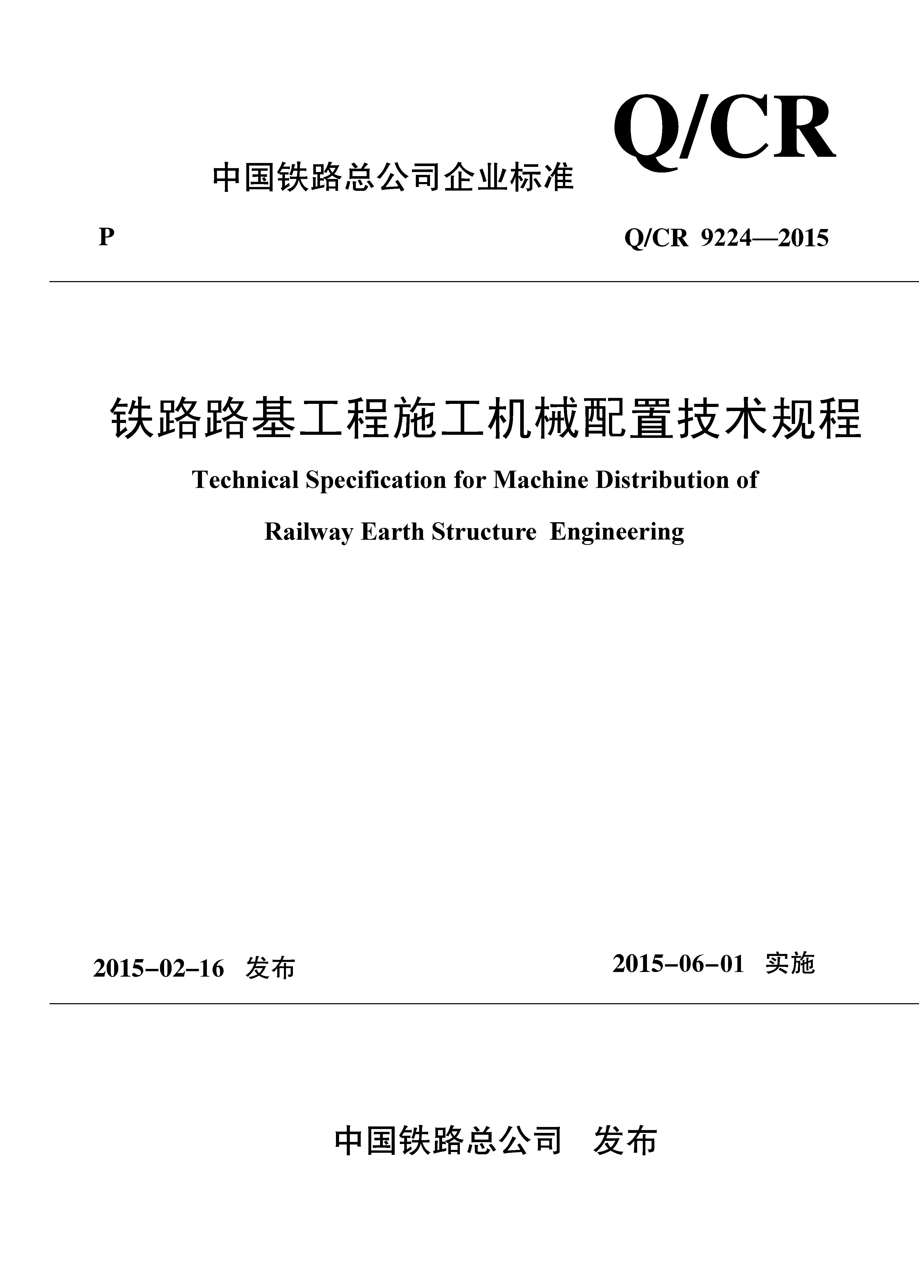 书名:Q/CR 9224-2015 铁路路基工程施工机械配置技术规程