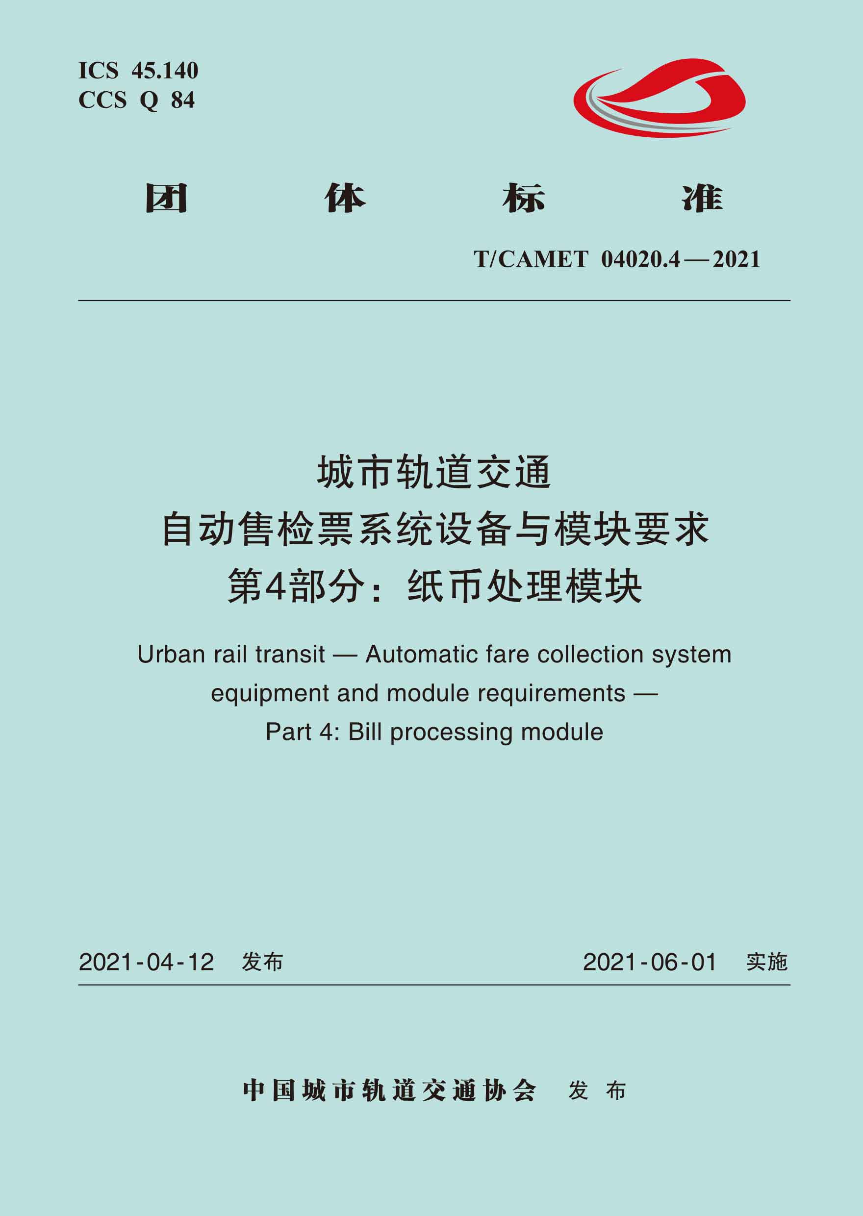 书名:城市轨道交通 自动售检票系统设备与模块要求 第4部分:纸币处理模块(T/CAMET 04020.4—2021)