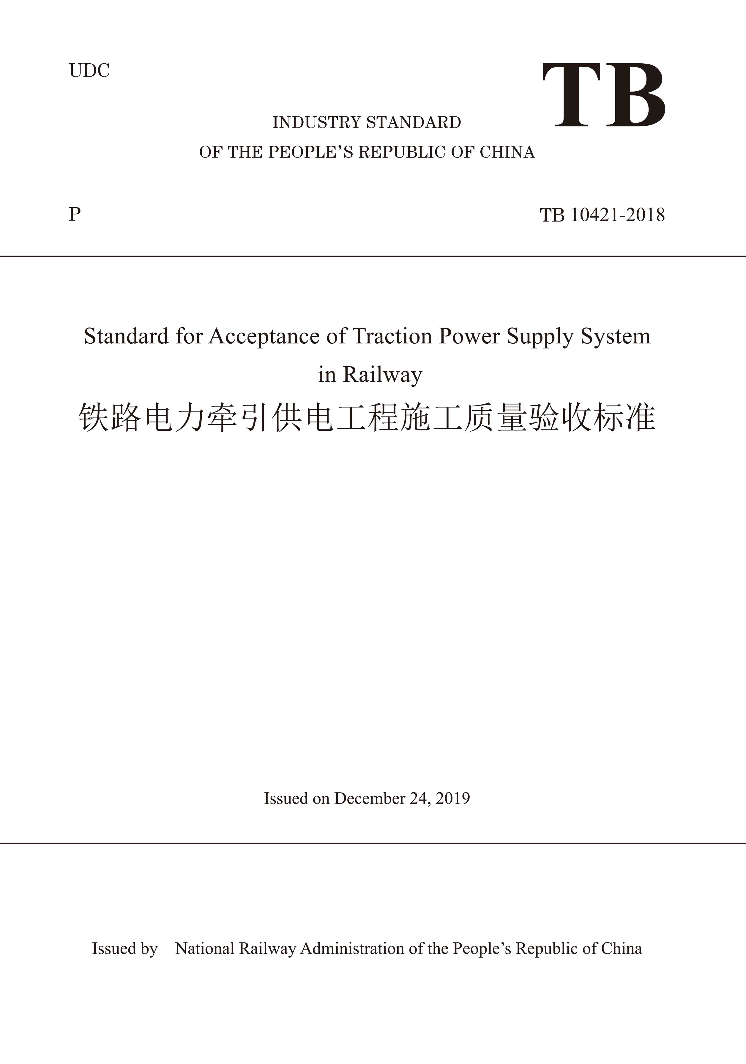 书名:Standard for Acceptance of Traction Power Supply System in Railway(铁路电力牵引供电工程施工质量验收标准(TB 10421-2018))