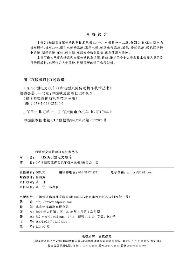 《和谐型交流传动机车技术丛书》是由中国铁路总公司机辆部组织编写铁路机车技术系列丛书,丛书预计18册,涵盖从2007年至今的三个系列共计18种型号和谐型机车。主要面向广大的铁路机车运用、检修、维护和技术管理人员,以及社会各界铁路机车爱好者。 《HXD1C型电力机车》是《和谐型交流传动机车技术丛书》之一,共分十二章,别对机车主要技术性能及参数,机车总体及通风冷却系统、牵引电传动系统、高压电器、辅助电气系统、微机网络控制系统、制动系统、车体及转向架、列车运行控制系统车载设备、机车试用于维护等方面进行了介绍。该书图文并茂、通俗易懂,是一本通用的机车技术科技书籍。 -