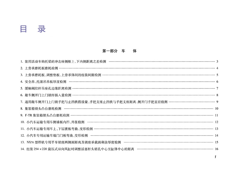 本书分为车体、车钩缓冲装置、转向架、轮轴、制动五个部分,每一部分都包含了铁路货车段修过程中的主要检测项点,每一个检测项点均涵盖检修限度、检测要求、量具示例及检测说明、检测示意四部分内容。检测限度汇总统一了相关技术要求;检测要求科学合理,明确了检测基准和部位,是使用检测器具及制定检修工艺必须执行的基本技术要求;量具示例、检测说明和检测示意图文并茂,便于读者理解和掌握量具的使用和具体检测方法,能有效地指导货车段修工作。本书严格执行规章、标准要求,兼顾生产实际、操作方便等因素,内容覆盖了货车段修过程中相关检测项点,提供了检测说明和图示,规范了测量基准、检测过程等各项内容,既适用于铁路货车段修相关一线职工,也适用于检测器具的研发、生产以及相关检修工艺的制定等各项工作科研人员。 -