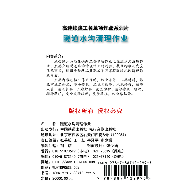 中国铁道出版社有限公司,组织策划制作了铁路工务单项作业系列教学片,以铁路工务单项作业指导书为蓝本,从数百个作业项目中选出最常用的75种,在十几个铁路单位的配合下,历时一年多,经多次审改,最终拍摄制作完成的铁路一线职工单项作业培训的系列音像教学片。