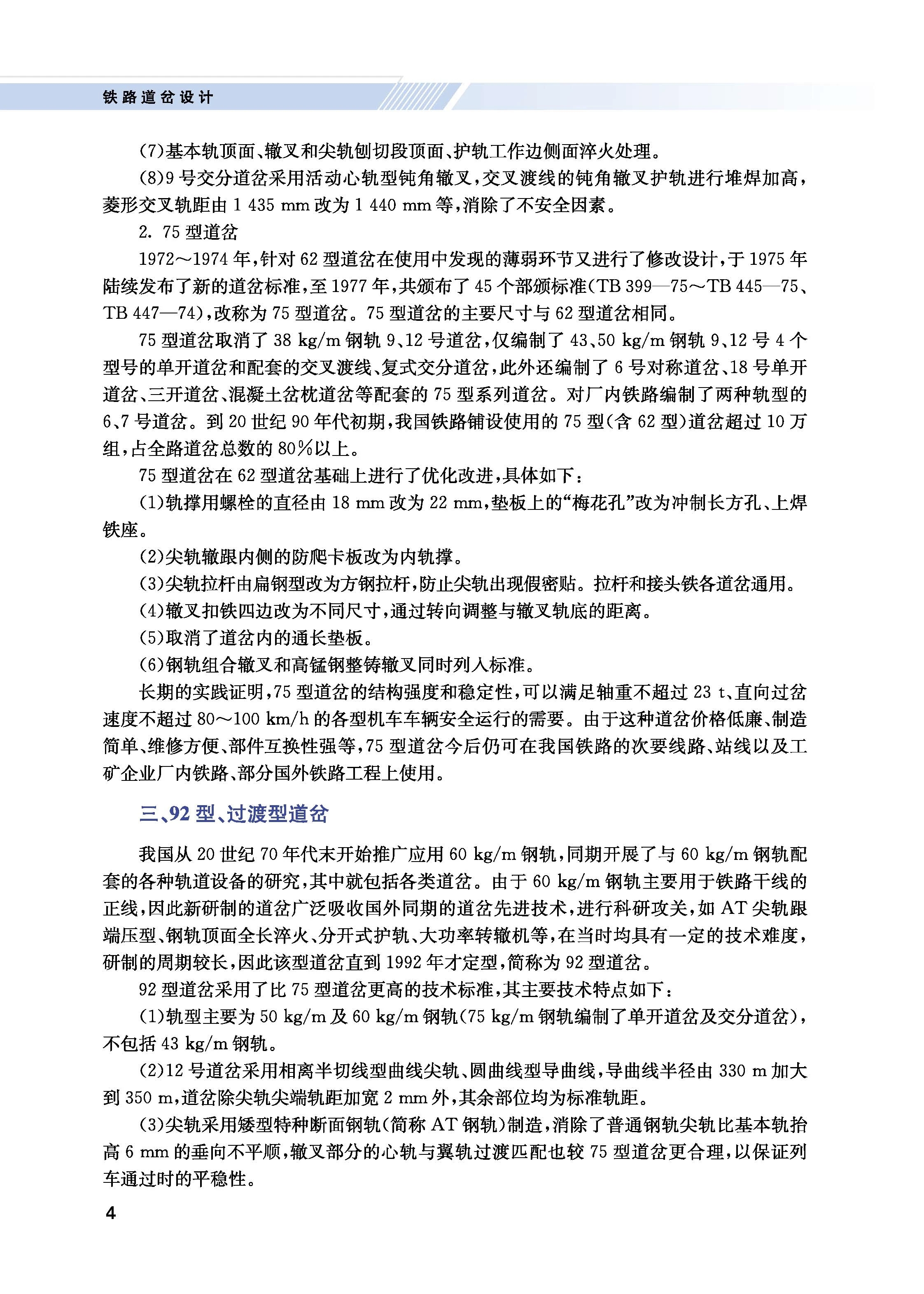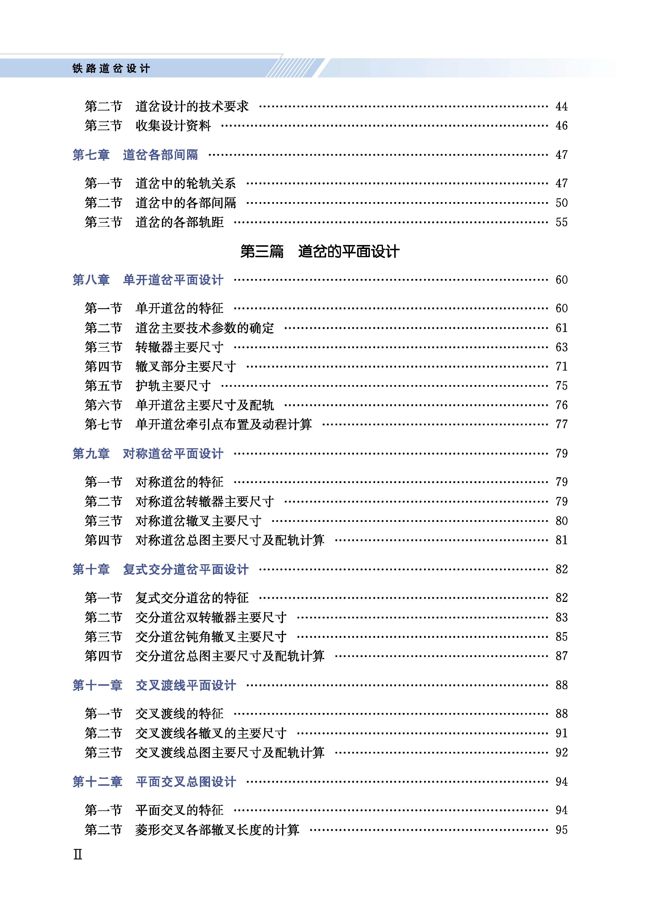 系统总结了92型道岔、提速道岔、高速道岔和重载道岔设计的成功经验,针对目前的设计方法、设计手段、生产制造工艺水平,重新编写了道岔设计相关内容。