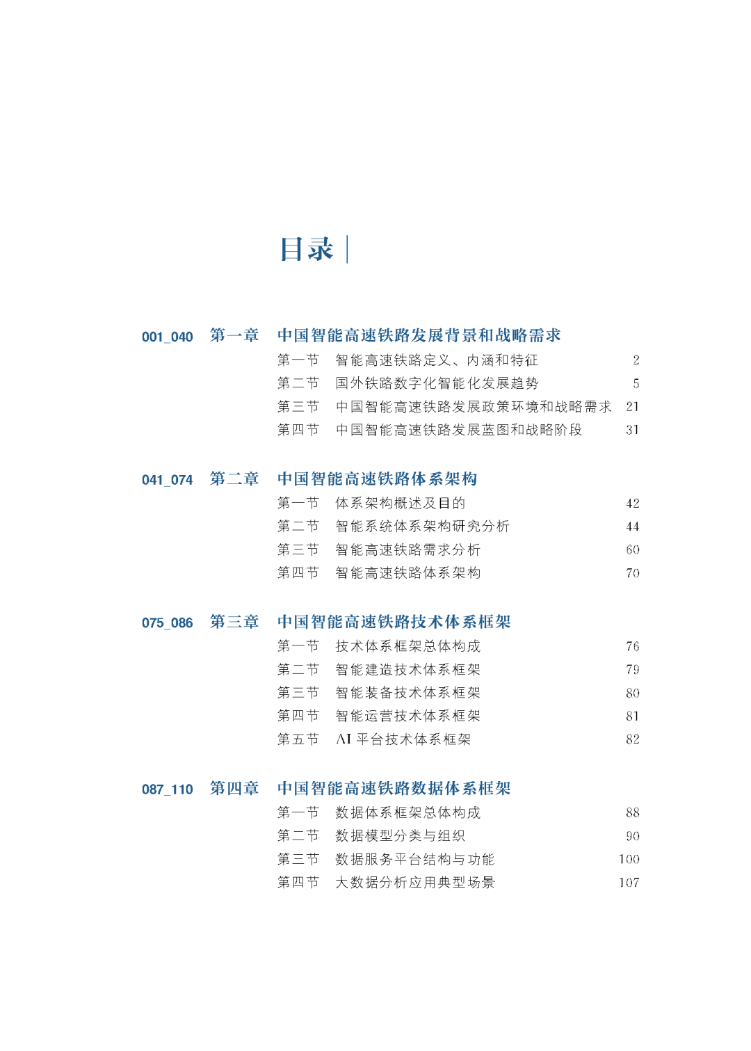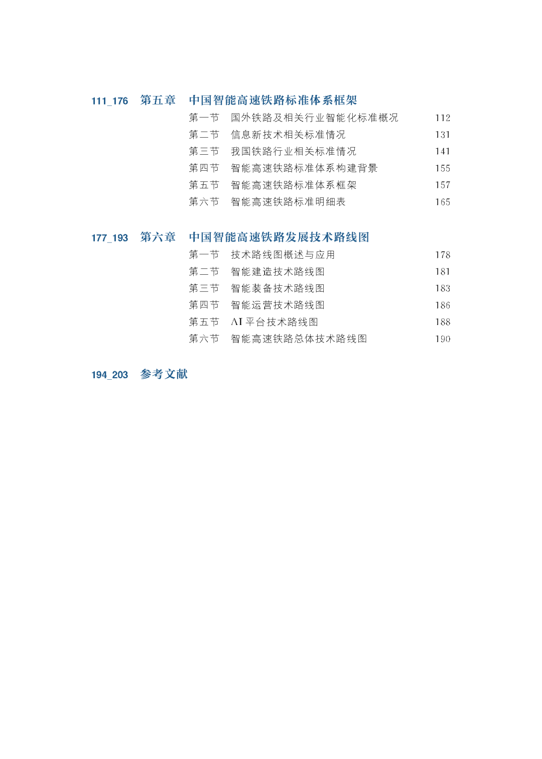 本书共六章。第一章提出了智能高速铁路的定义、内涵和特征,研究了国外铁路数字化智能化发展趋势,分析了中国智能高速铁路发展的政策环境和战略需求,规划了中国智能高速铁路的发展蓝图,提出了智能高速铁路三阶段发展战略。第二章至第五章创新性地提出技术、数据、标准体系三位一体的智能高速铁路体系架构,技术体系涵盖了智能建造、智能装备、智能运营和AI平台,明确了其间相互关系;数据体系涵盖了数据汇集、存储分析和应用展示,明确了数据服务平台结构、功能及全生命周期的数据传递;标准体系涵盖了通用基础与管理标准、智能高速铁路技术标准、平台及支撑技术标准等;提出了智能高速铁路标准体系架构和标准明细表,为中国智能高速铁路发展提供了顶层设计指导。第六章从需求、目标、关键技术、通用技术、应用示范等方面分别设计了智能建造、智能装备、智能运营和AI平台的技术路线图,围绕创新示范、加速突破、全面提升三个阶段提出了中国智能高速铁路发展技术路径图。